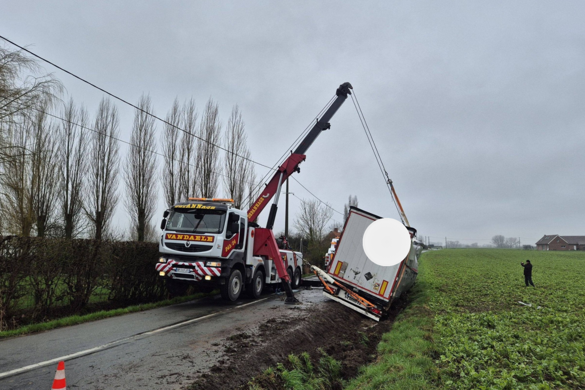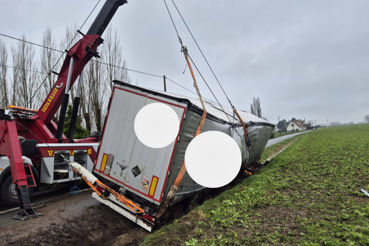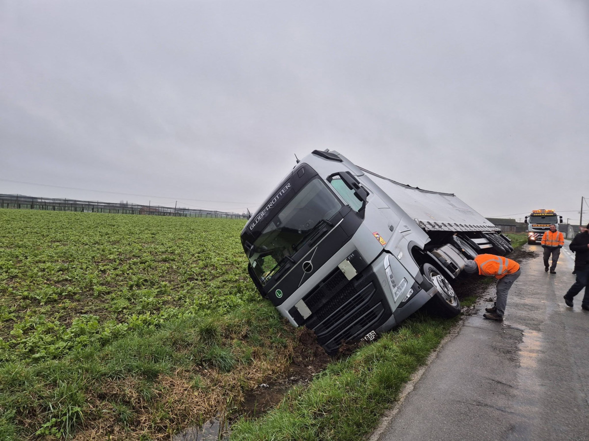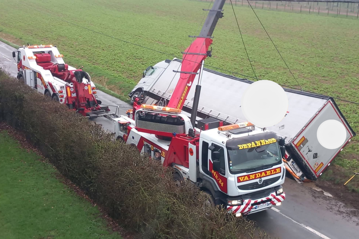 Intervention suite à la sortie de route d’un ensemble routier chargé à 44 tonnes, ayant glissé dans le fossé lors d’un croisement avec un autre poids lourd sur une route sinueuse: