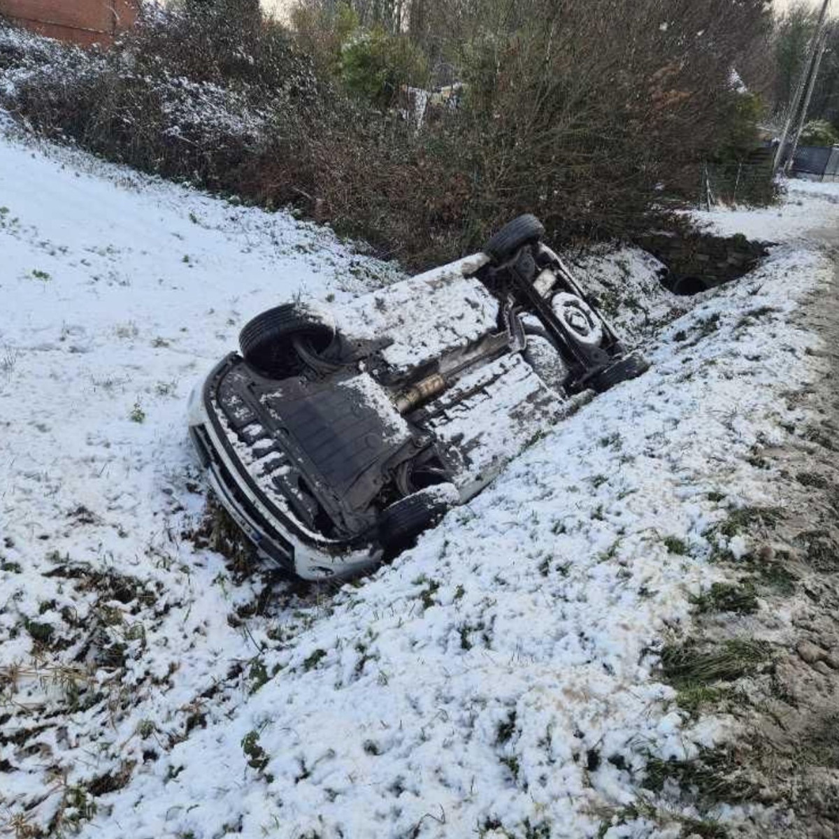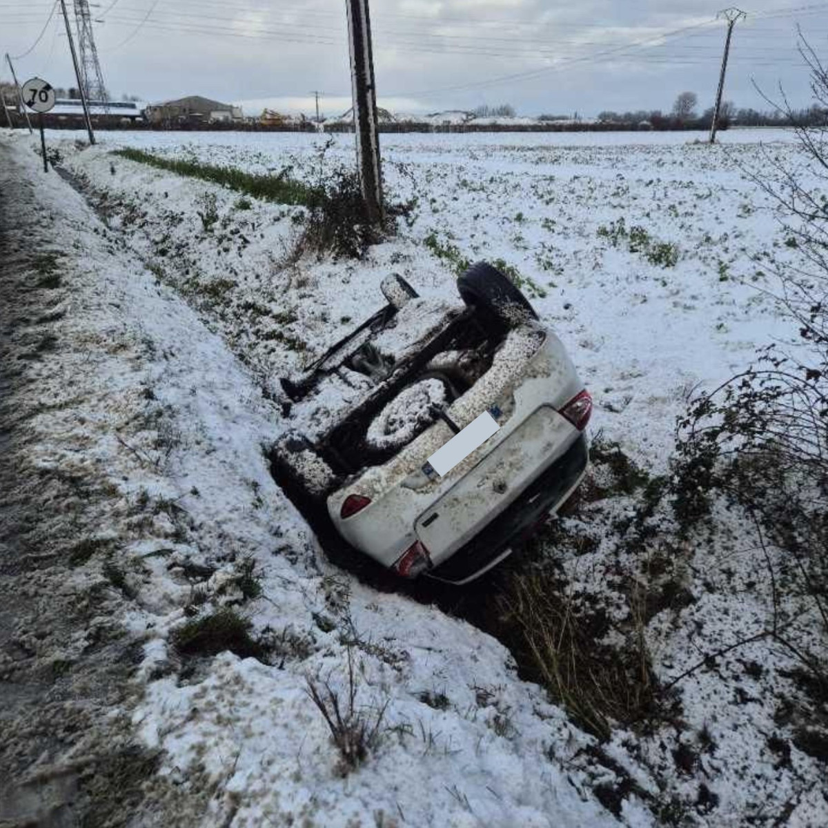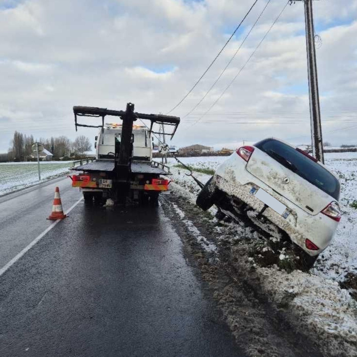 Intervention suite à une sortie de route sur chaussée enneigée.